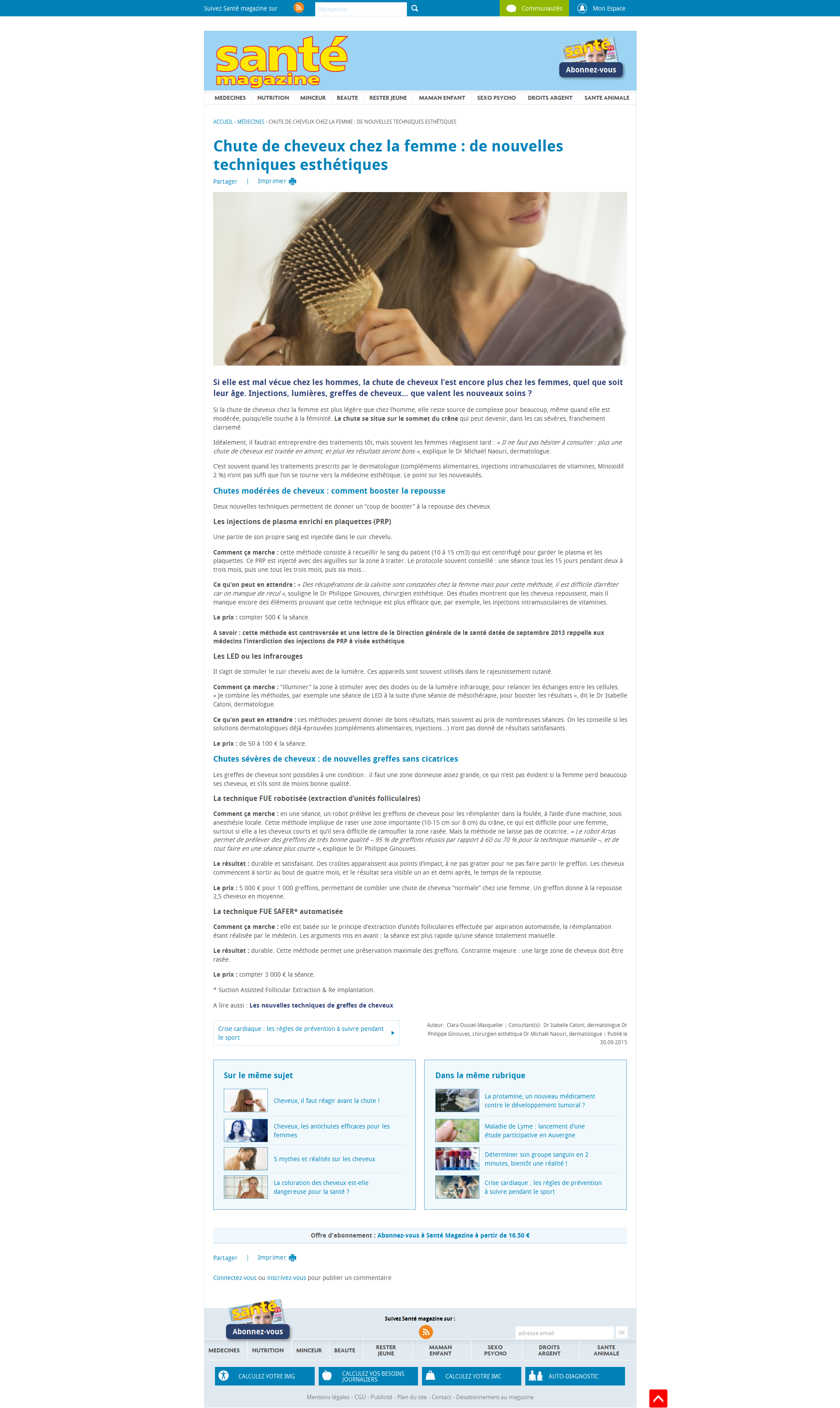 Chute de cheveux chez la femme : de nouvelles techniques esthétiquesSANTÉ MAGAZINE Le 29 septembre 2015 >> Lisez l'article en ligne ou téléchargez-le : Cliquez pour telecharger le fichier Telechargement en cours