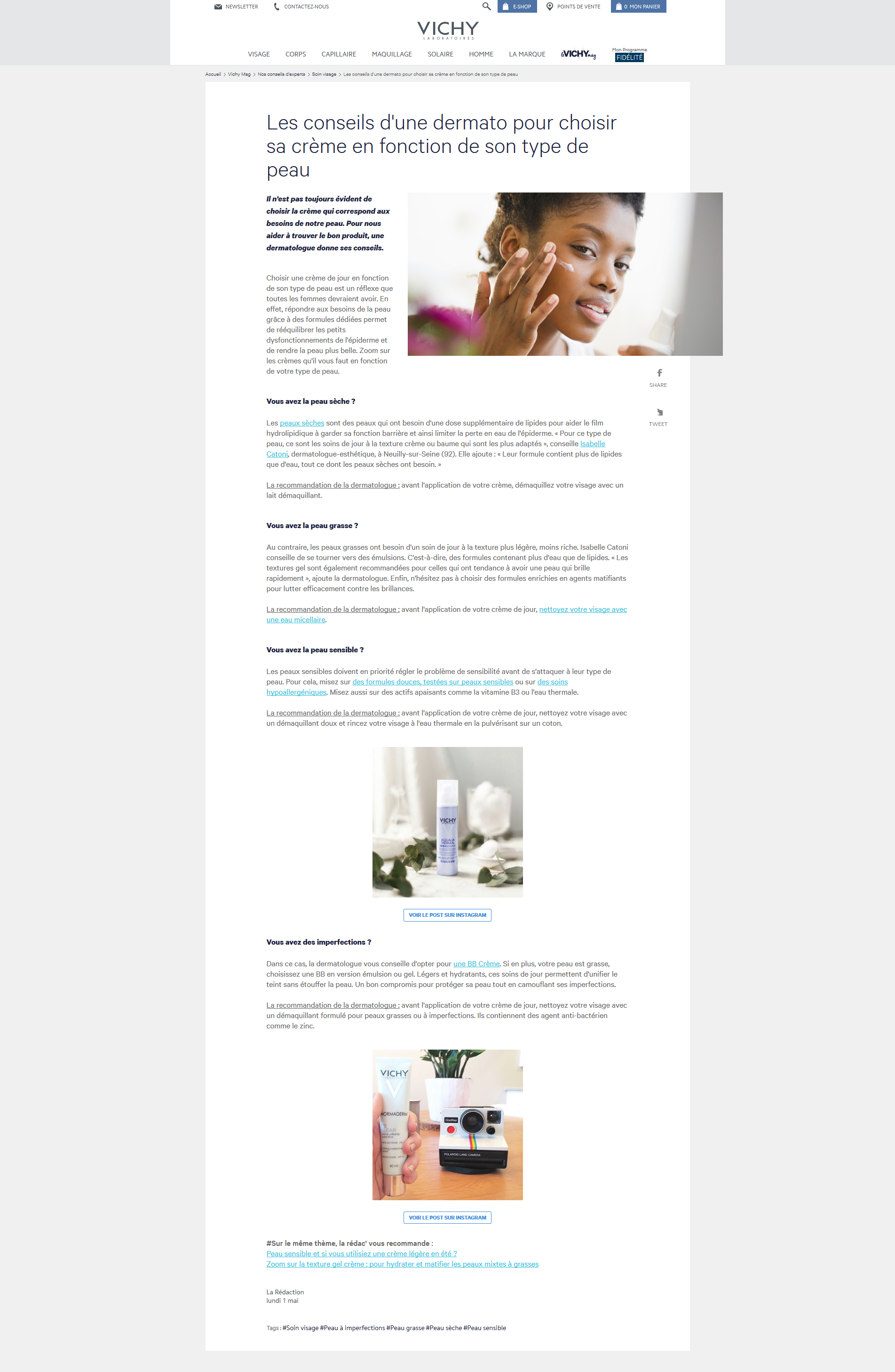 Les conseils d'une dermato pour choisir sa crème en fonction de son type de peauVICHY.FR 1er mai 2017 >> Lisez l'article en ligne ou téléchargez-le : Les conseils de votre dermato pour choisir sa crème en fonction de son type de peau Cliquez pour telecharger le fichier Telechargement en cours