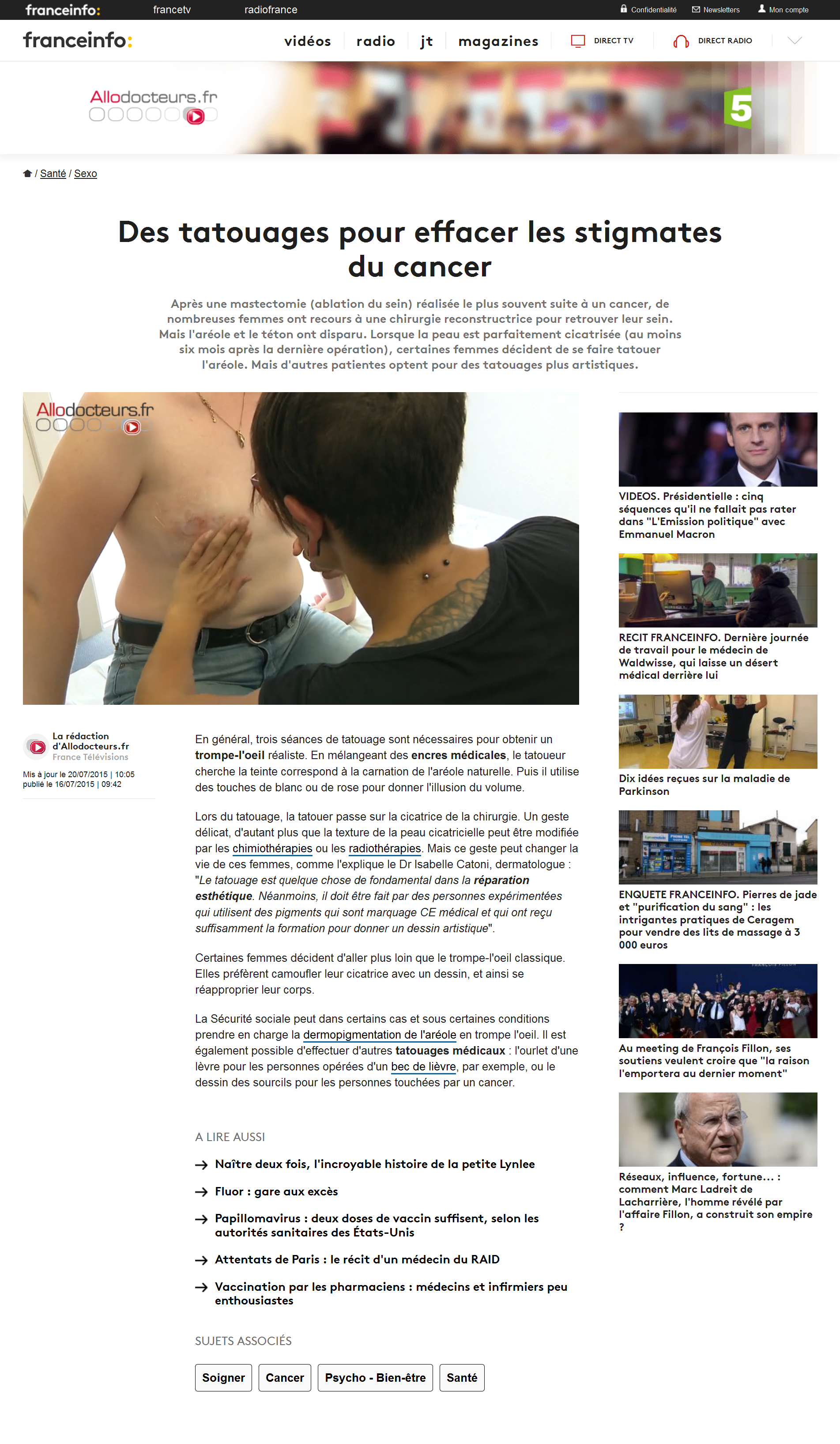 Des tatouages pour effacer les stigmates du cancerFRANCE INFOLe 16 juillet 2015 >> Lisez l'article en ligne ou téléchargez-le : Cliquez pour telecharger le fichier Telechargement en cours