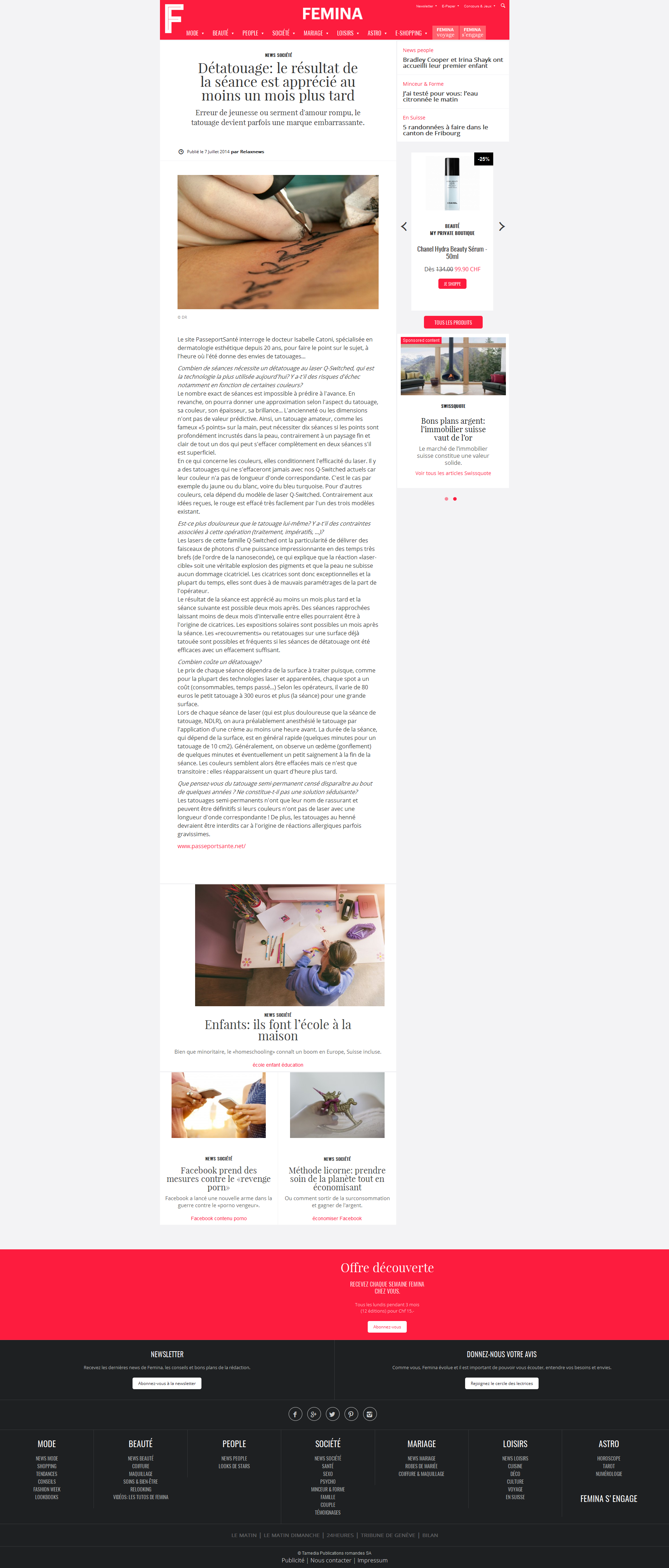 Détatouage : le résultat de la séance est apprécié au moins un mois plus tardFEMINA Le 07 juillet 2014 >> Lisez l'article en ligne ou téléchargez-le : Cliquez pour telecharger le fichier Telechargement en cours