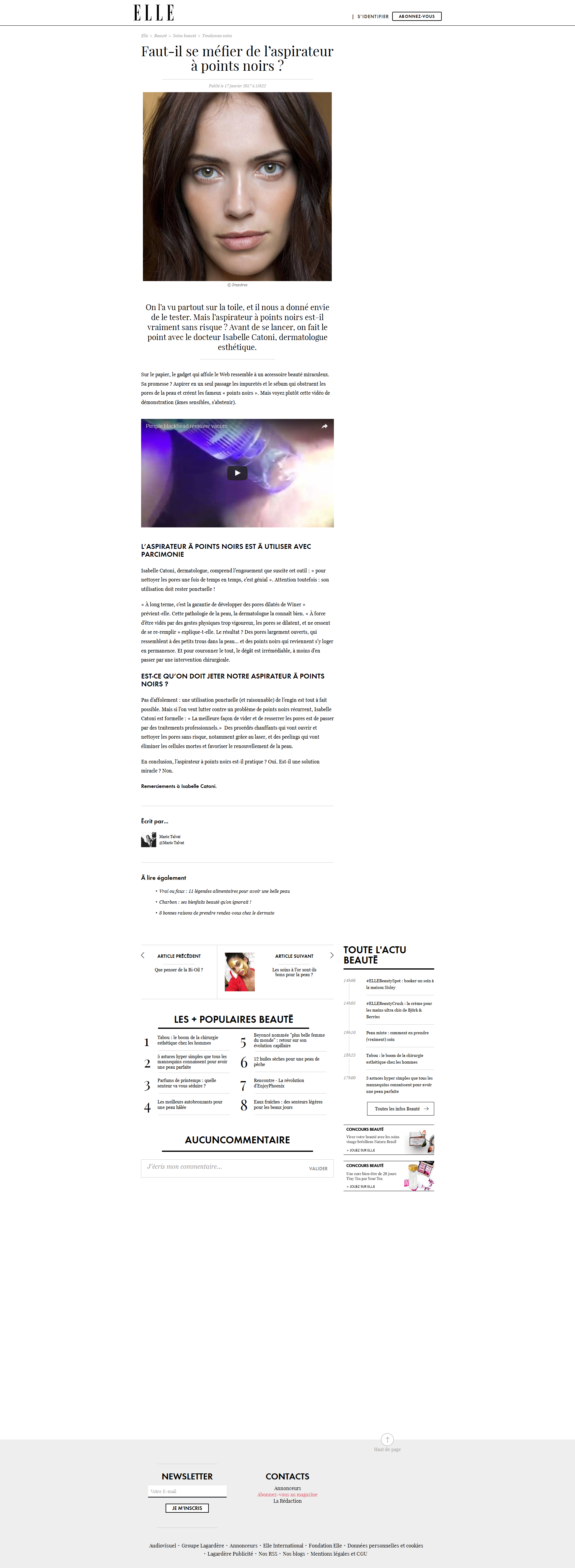 Faut-il se méfier de l’aspirateur à points noirs ?ELLE Le 17 janvier 2017 >> Lisez l'article en ligne ou téléchargez-le : Cliquez pour telecharger le fichier Telechargement en cours