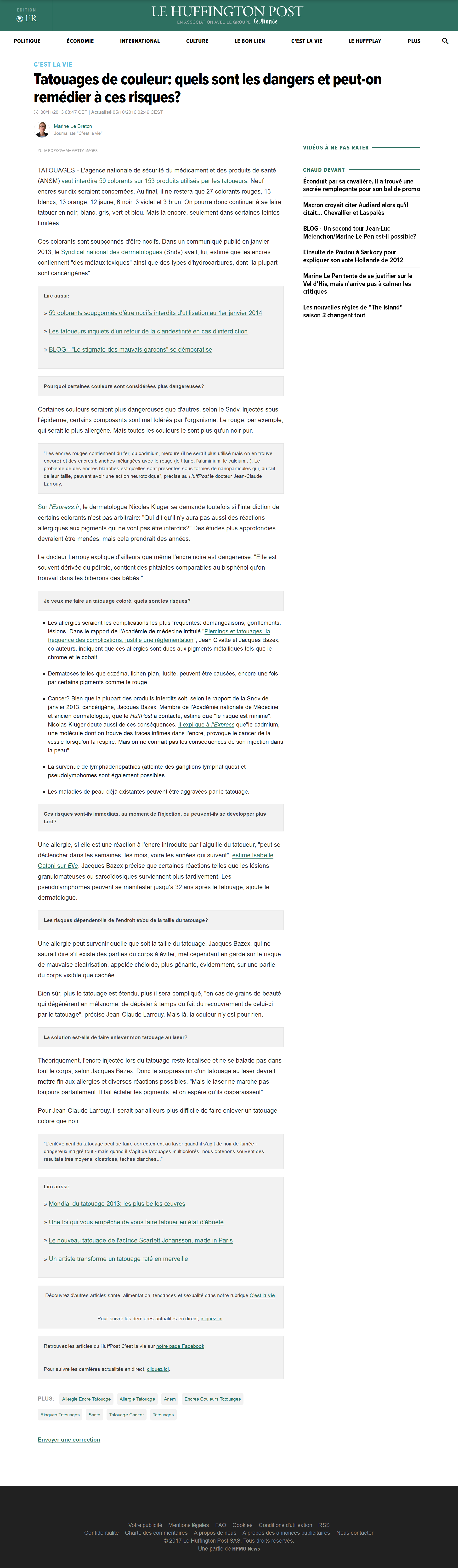 Tatouages de couleur : quels sont les dangers et peut-on remédier à ces risques ?LE HUFFINGTON POSTLe 05 octobre 2016 >> Lisez l'article en ligne ou téléchargez-le : Cliquez pour telecharger le fichier Telechargement en cours